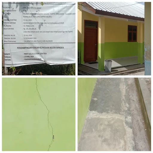 Pembangunan Ruang kelas Baru di SMP Negeri 4 Bintet kecamatan Belinyu yang menggunakan APBD kabupaten Bangka tahun 2024sudah banyak kelihatan retak dibeberapa titik.